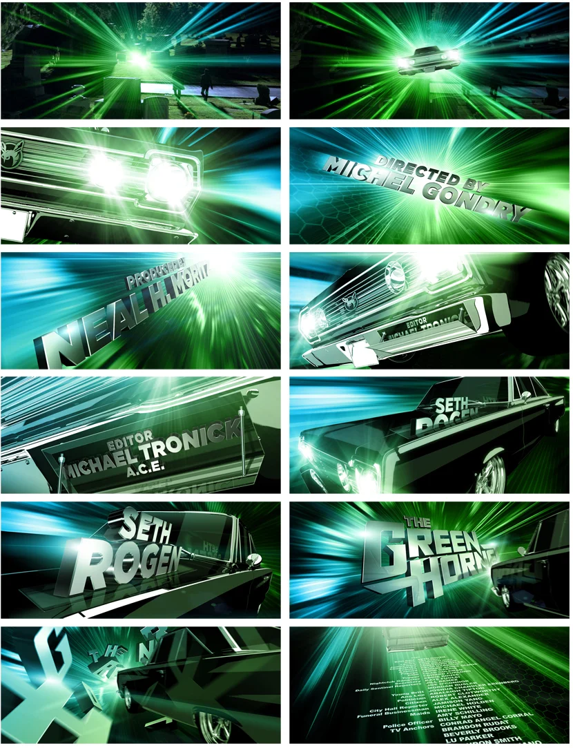 While working on the Picture Mill team, our clients, Academy Award Winning French Director Michel Gondry and Actor/Producer Seth Rogen, ended up responding to a classic 60's theme to compliment the tone of the film. We built the sequence in stereoscopic 3D. I was responsible for modifying a stock 3D car model (modeling, lighting, texturing) to resemble the likeness of the actual Black Beauty used in the film. I also created multiple typography cards within Cinema 4D. I worked in collaboration with Senior Designer Greg Sheldon on the storyboard below. I produced all 3D renders of the Black Beauty car, as well as all typography.